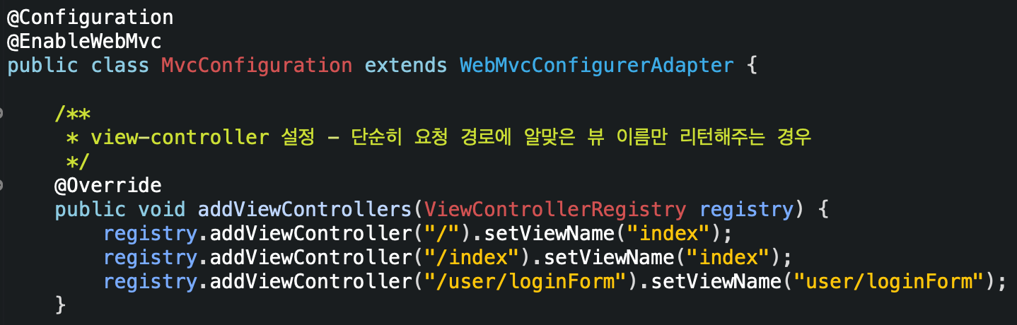 @EnableWebMvc를 사용하는 경우에는 [사진 2]에서와 같이 WebMvcConfigurerAdapter의 addViewControllers 메서드를 구현하면 된다.